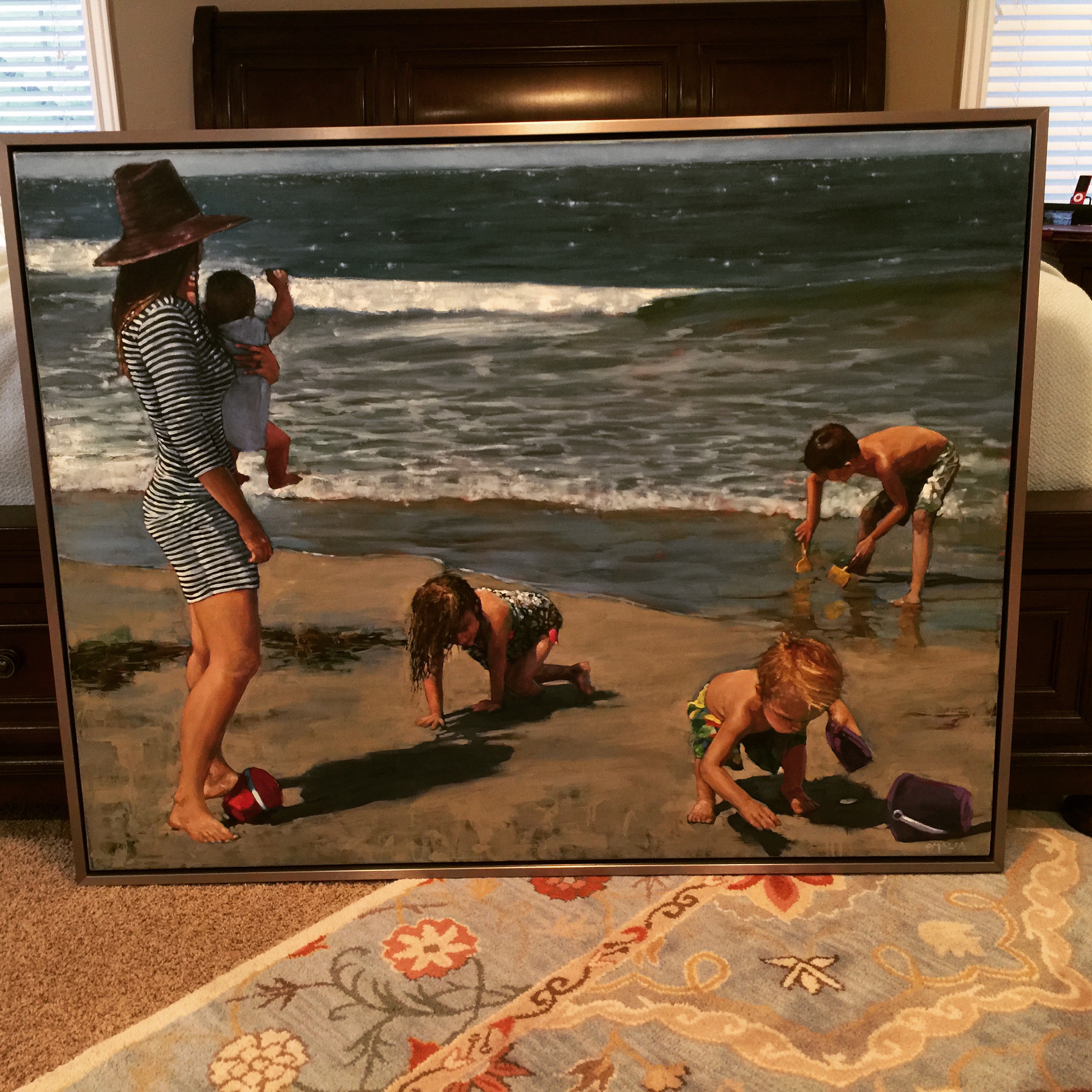 My wife has had four surgeries this year, and she had her fourth kid this year, via C-section, and she has endured those four kids with the highest amount of travel for my work in our marriage. I was gone close to 100 days this year. All through that she has been the always kind and patient woman that she is. Our relationship is better than I ever thought possible and I owe almost all of that to her wonderful personality and love for me. This year I found the perfect gift for her and I surprised her on Christmas with it. She loves the beach so much, and earlier this year there was this awesome photo taken of her and the four kids playing on the beach. She loved it so much she got it framed, but little did she know that I decided, with the help of my family and hers, to get the picture commissioned into a 52″ x 40″ oil painting. I told her I didn’t like the picture in the frame, and it made her a little sad, but she moved it to our room instead of the living room. We have a tradition of not getting each other gifts on Christmas, but writing love letters to each other, so on Christmas morning as she was reading my letter, my family got the painting in position. At the bottom of my letter I told her to go into my parents room for the surprise of her life, and so she reluctantly got up and walked to their room. I will let the picture and video tell the rest.